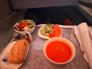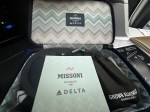 There are more buttons in a Delta One seat than the cockpit. Do you want to sit upright? Lie flat? Feet elevated? NO PROBLEM! I barely got my bag put away before I was offered something to drink. Champagne? OF COURSE! Each pod is equipped with noise cancelling headphones, a comfy blanket and pillow, slippers, an exclusive Missoni amenity kit with Grown Alchemist skincare products, a toothbrush, eye mask, a pair of socks and other items meant to make your journey comfortable. There is also lighting for whatever mood you may be in.